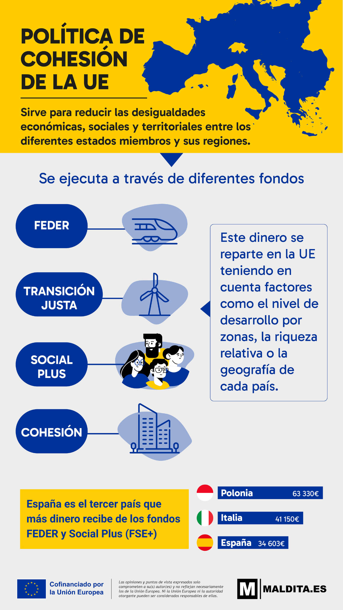 La política de cohesión se dirige a todas las regiones y ciudades de la UE con el fin de apoyar la creación de empleo, la competitividad empresarial, el crecimiento económico, el desarrollo sostenible y para mejorar la calidad de vida de los ciudadanos. Y se ejecuta a través de diferentes fondos específicos: