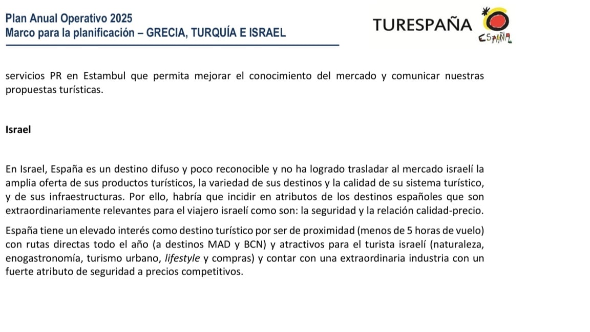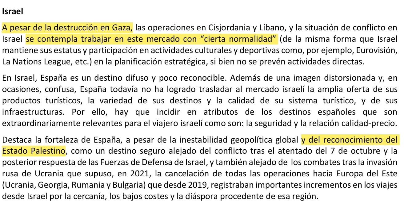 El organismo adscrito al Ministerio de Turismo encargado de promocionar España en el mundo, Turespaña, ha modificado el Plan Anual Operativo 2025 publicado en su página web para borrar la referencia al reconocimiento del Estado de Palestina por parte del Gobierno de España. Además, ha eliminado un primer párrafo en el que explica que “a pesar de la destrucción en Gaza, las operaciones en Cisjordania y Líbano, y la situación de conflicto en Israel se contempla trabajar en este mercado con “cierta normalidad” (de la misma forma que Israel mantiene sus estatus y participación en actividades culturales y deportivas como, por ejemplo, Eurovisión, La Nations League, etc.) en la planificación estratégica, si bien no se prevén actividades directas”.