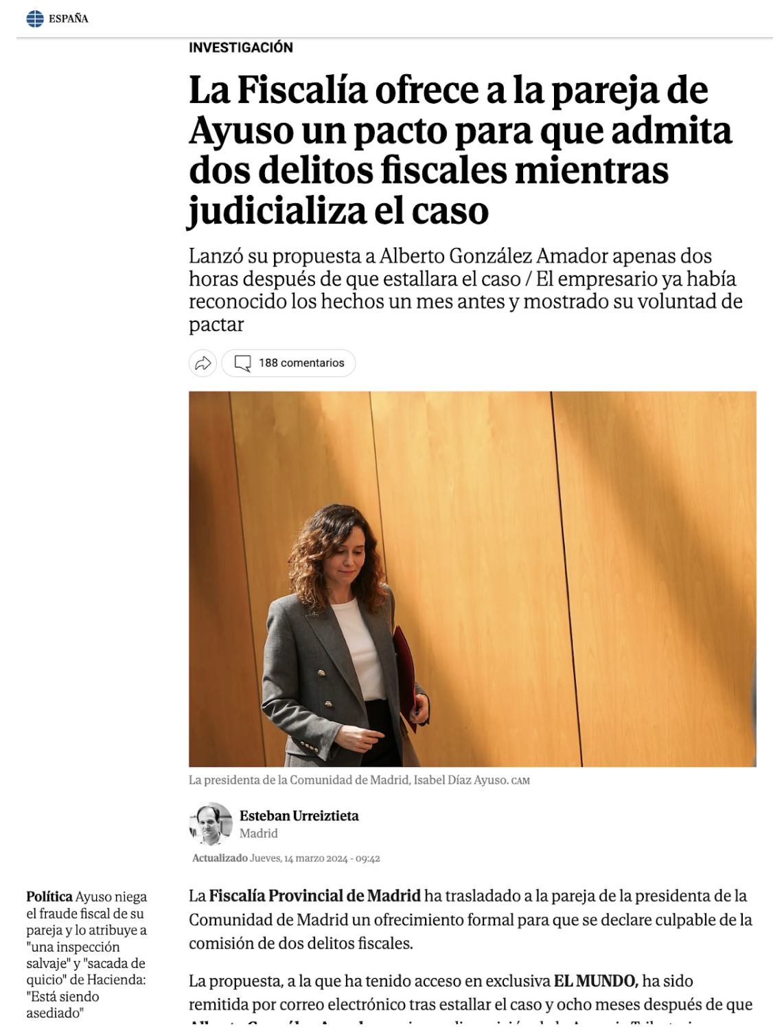 La tesis central, que reconoció el jefe de Gabinete de Ayuso, era que el Ministerio Fiscal había ofrecido un pacto a la pareja de Ayuso para alcanzar la conformidad penal, pero que esta supuesta oferta había sido retirada por “órdenes de arriba”. MAR dijo haber enviado a El Mundo un correo electrónico del fiscal Julián Salto, y el medio publicó que dicho correo probaba que era la Fiscalía quien había ofrecido el pacto. La publicación sigue en la página de El Mundo. MAR también difundió esta afirmación en redes sociales.