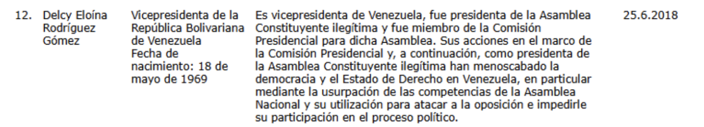 “Bueno, yo en ese momento desconocía absolutamente que la vicepresidenta del Gobierno de Venezuela tuviera sanciones personales de prohibición de pisar suelo europeo y, en el momento en el que tengo conocimiento de ello”, añade, le comunica a su entonces ministro de Transportes, José Luis Ábalos, que “no puede estar en suelo español” [min. 14:38]. Estas sanciones las impuso el Consejo de la Unión Europea el 25 de junio de 2018 contra once funcionarios y miembros del Gobierno de Venezuela, entre ellos, Rodríguez.
