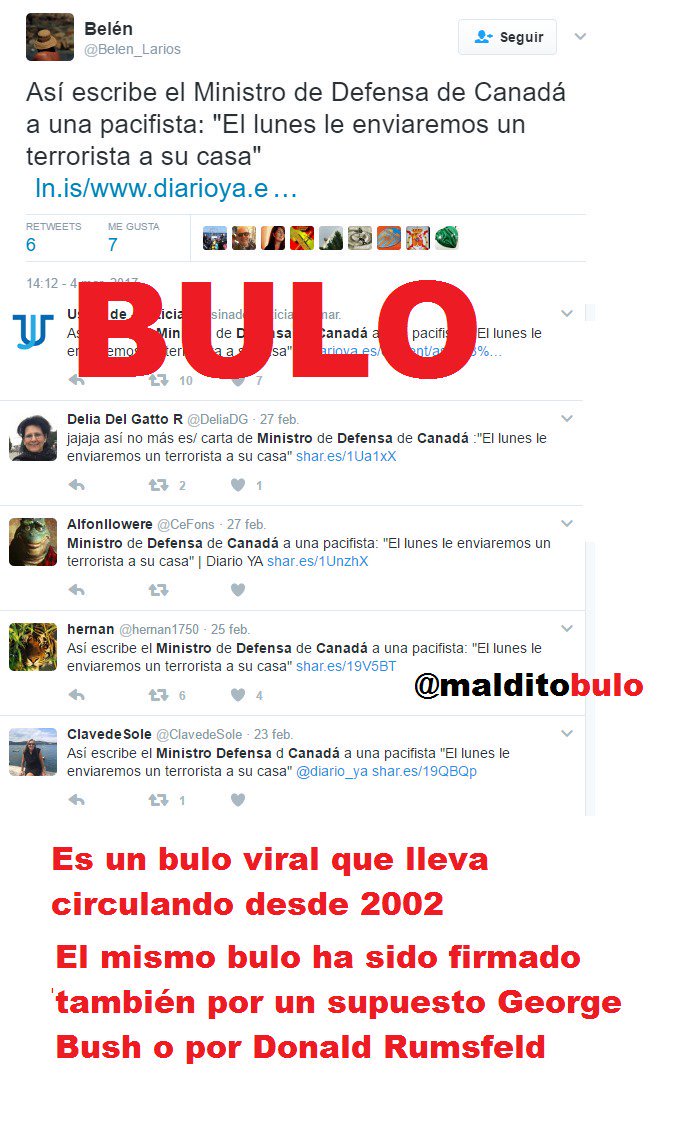 No, el ministro de Defensa canadiense no ha escrito a un pacifista diciendo que va a enviarle un terrorista a casa