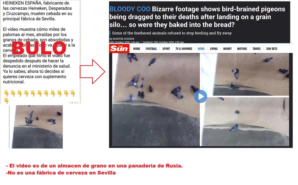 HEINEKEN ESPAÑA, fabricante de las cervezas Heineken, Desperados y Cruzcampo, muelen cebada en su principal fábrica de Sevilla. El vídeo muestra cómo miles de palomas al mes, atraídas por los granos de cebada, son absorbidas y acaban molidas. Todo va a parar a la cerveza. El empleado que filmó el vídeo fue despedido después de hacer la denuncia en el ministerio de salud. Ya lo sabes, ahora tú decides si quieres cerveza como suplemento nutricional.