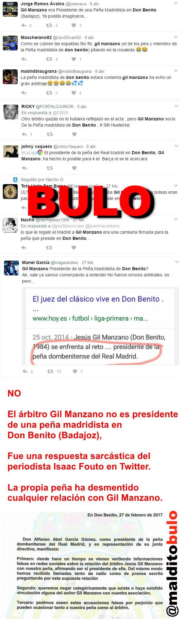 No. El árbitro Gil Manzano no es el presidente de una peña madridista en Don Benito, Badajoz.