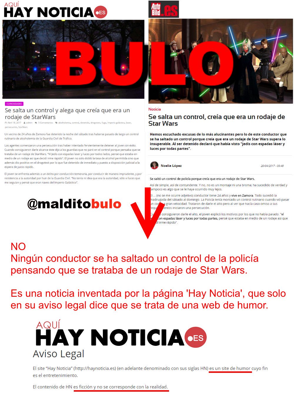 No. Ningún conductor se ha saltado un control de alcoholemia pensando que era un rodaje de Star Wars. Es una noticia inventada por la web de "humor" Hay Noticia. En el aviso legal de la página informa de que se trata de una web de humor.