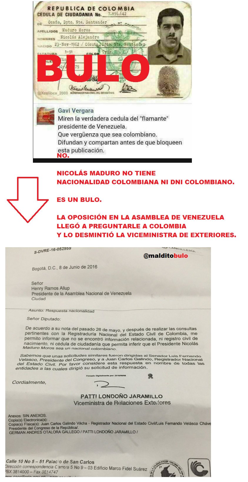 No, Nicolás Maduro no nació en Colombia ni tampoco tiene un DNI colombiano. Es un bulo que fue desmentido por la exvicepresidenta de Exteriores de Colombia después de que los grupos de oposición venezolanos hubieran preguntado por ello.