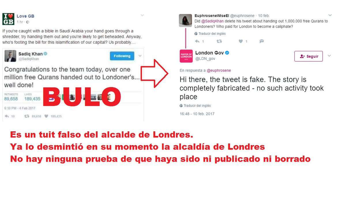 El tuit del alcalde de Londres diciendo que ha repartido 1.000.000 de coranes es falso. Lo desmintió en su día la alcaldía de Londres y no hay ninguna prueba ni de que haya sido publicado ni de que haya sido borrado.
