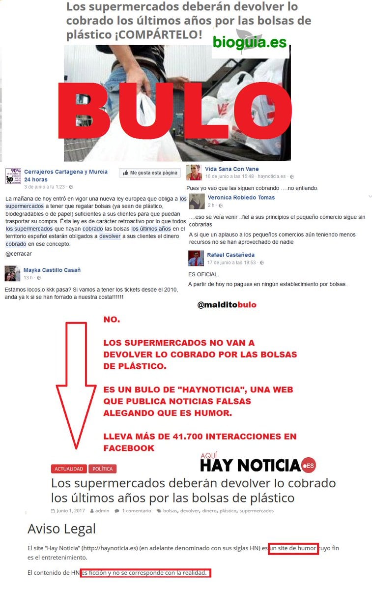 NO. Los supermercados no van a devolver lo cobrado por las bolsas de plástico. El origen del bulo es "haynoticia.es", una web que dice en su aviso legal que hace "humor" y que todo es falso. Aunque no te haga gracia.