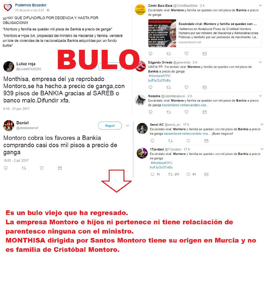 No. El ministro Montoro no se ha quedado 1000 pisos de Bankia a precio de ganga. Es bulo viejo. La empresa Montoro e hijos no tiene ninguna relación con el ministro Montoro. Monthisa dirigida por Santos Montoro tiene su sede en Murcia y no tiene relación con Cristobal Montoro.