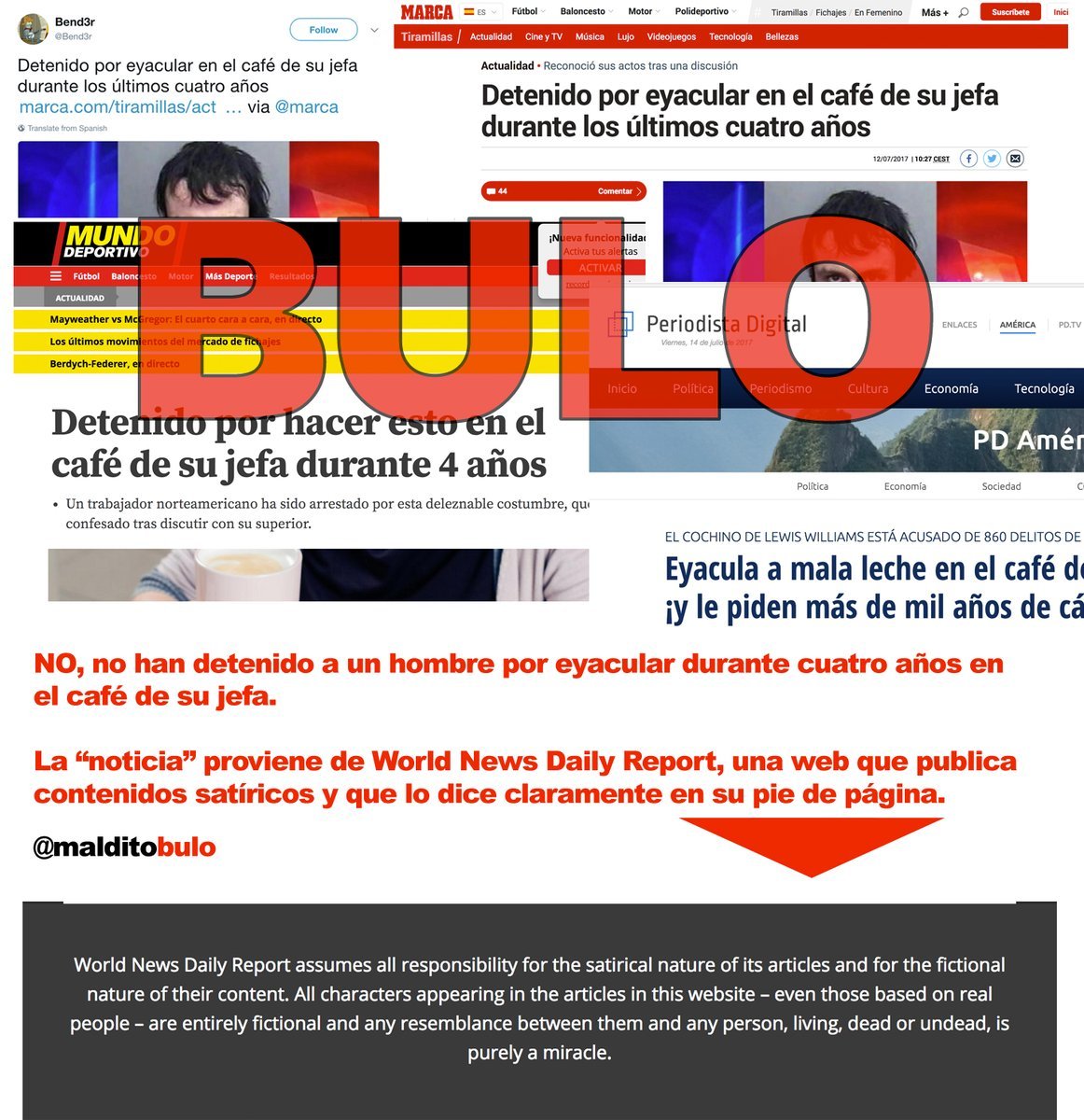 No. No han detenido a un hombre por eyacular en el café de su jefa durante 4 años. Es una noticia falsa de una web satírica: World News Daily Report