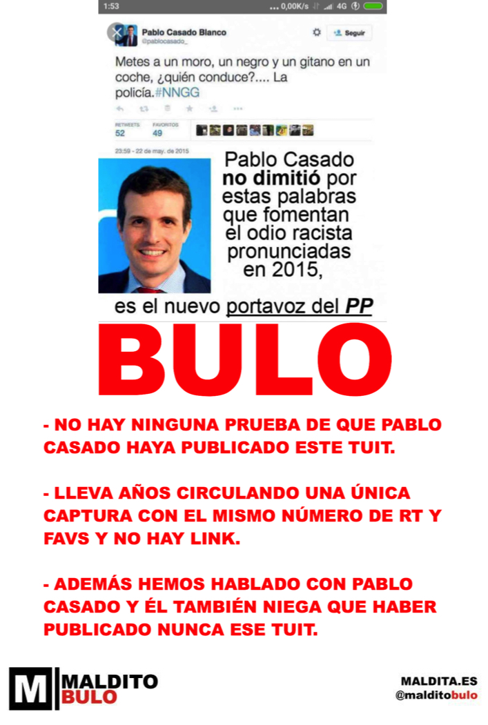 «[T] No, Pablo Casado no ha publicado un tuit con un chiste de "moros y gitanos" en un coche»