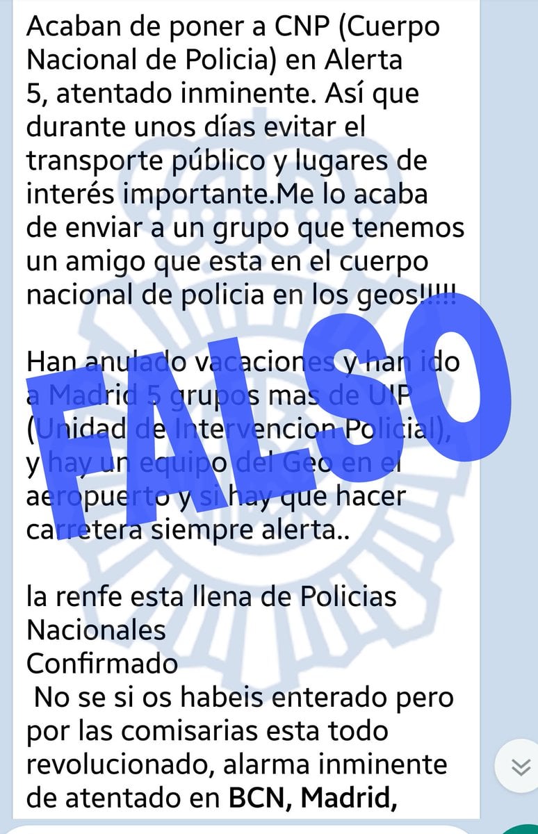 La policía ha desmentido nuevamente que España esté en nivel 5 de alerta terrorista. Es un bulo recurrente en cadenas de email y mensajerías de whatsapp que la Policía ha desmentido.