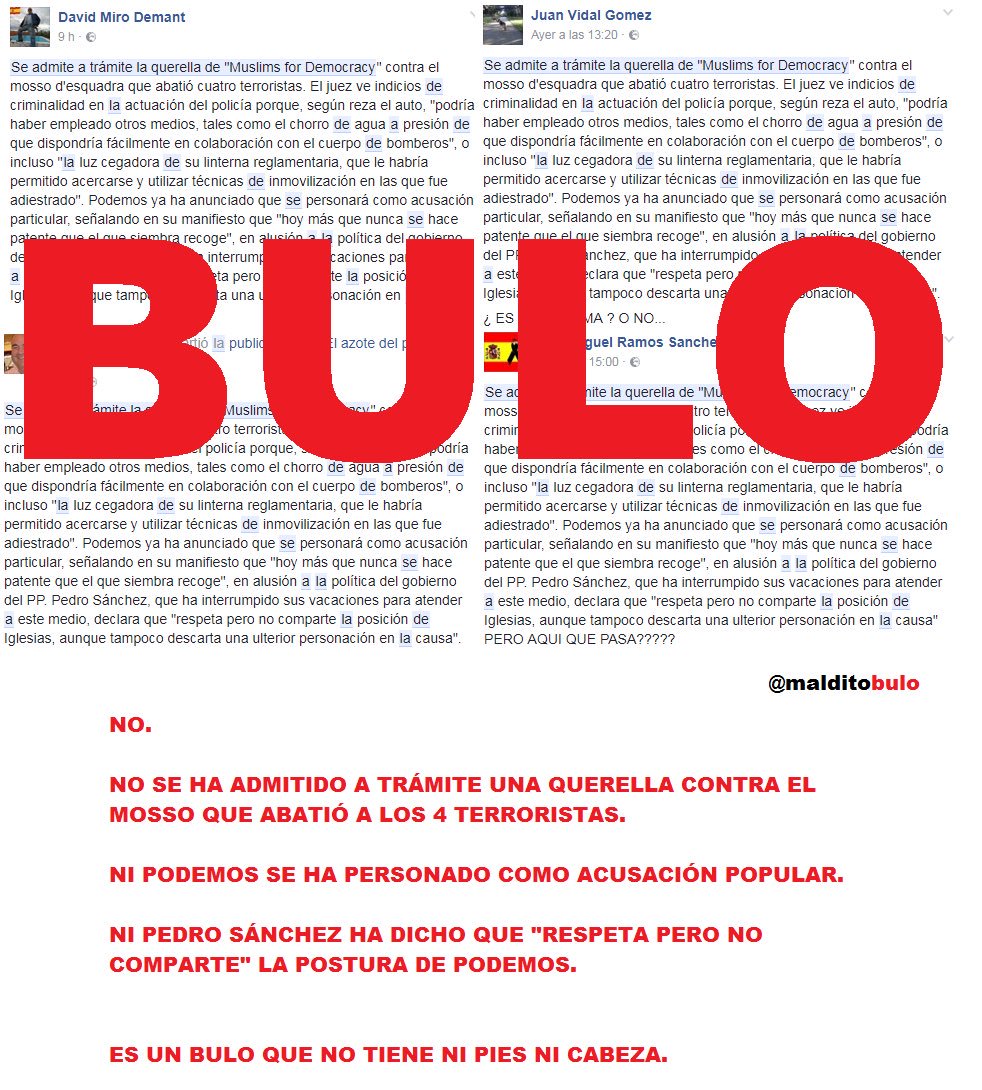 Se admite a trámite la querella de "Muslims for Democracy" contra el mosso d'esquadra que abatió cuatro terroristas. El juez ve indicios de criminalidad en la actuación del policía porque, según reza el auto, "podría haber empleado otros medios, tales como el chorro de agua a presión de que dispondría fácilmente en colaboración con el cuerpo de bomberos", o incluso "la luz cegadora de su linterna reglamentaria, que le habría permitido acercarse y utilizar técnicas de inmovilización en las que fue adiestrado", Podemos ya ha anunciado que se personará como acusación particular, señalando en su manifiesto que "hoy más que nunca se hace patente que el que siembra recoge", en alusión a la política del gobierno del PP, Pedro Sánchez, que ha interrumpido sus vacaciones para atender a este medio, declara que "respeta pero no comparte la posición de Iglesias, aunque tampoco descarta una ulterior personación en la causa"
