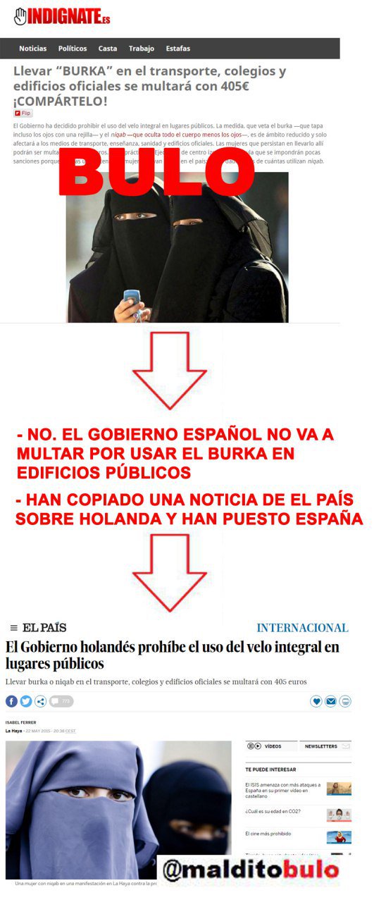El Gobierno español no va a multar a nadie por usar el burka en edificios públicos. La falsa noticia ha copiado una noticia sobre Holanda publicada en El País y han cambiado el titular.