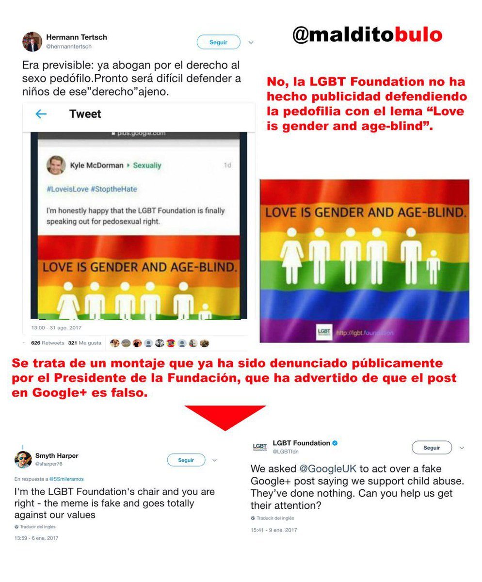«La LGTB Foundation ha hecho publicidad defendiendo la pedofilia con el lema "Love is gender and age-blind"»