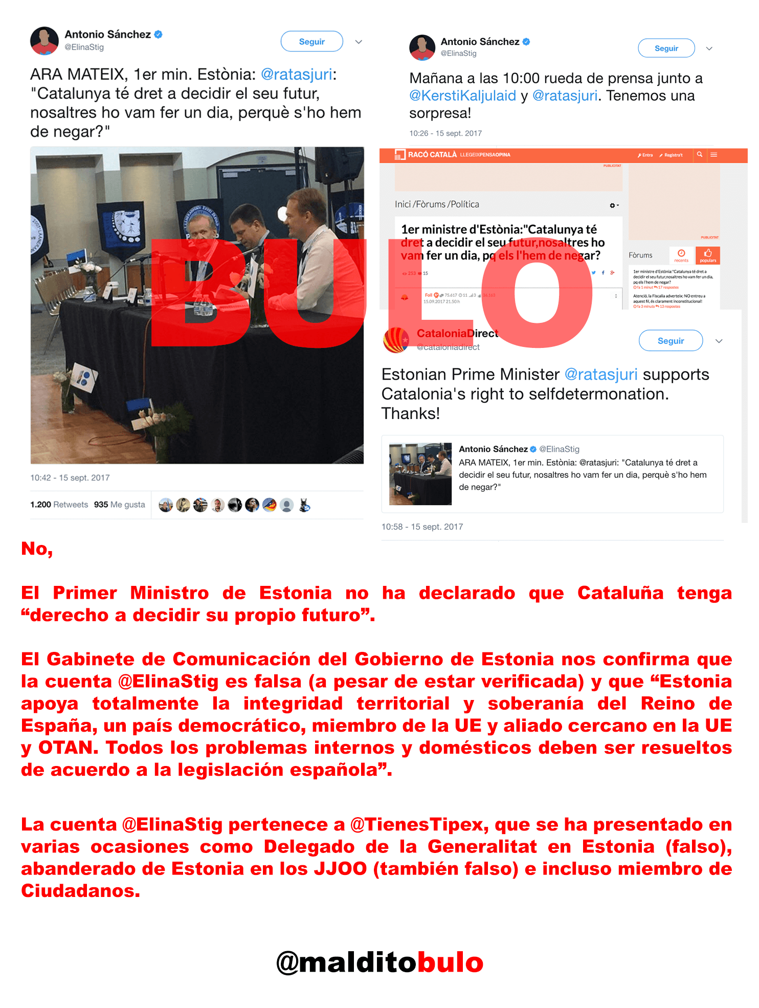 La cuenta @ElinaStig pertenece a @TienesTipex, que se ha presentado en varias ocasiones como Delegado de la Generalitat en Estonia (falso), abanderado de Estonia en los JJOO (también falso) e incluso miembro de Ciudadadanos.