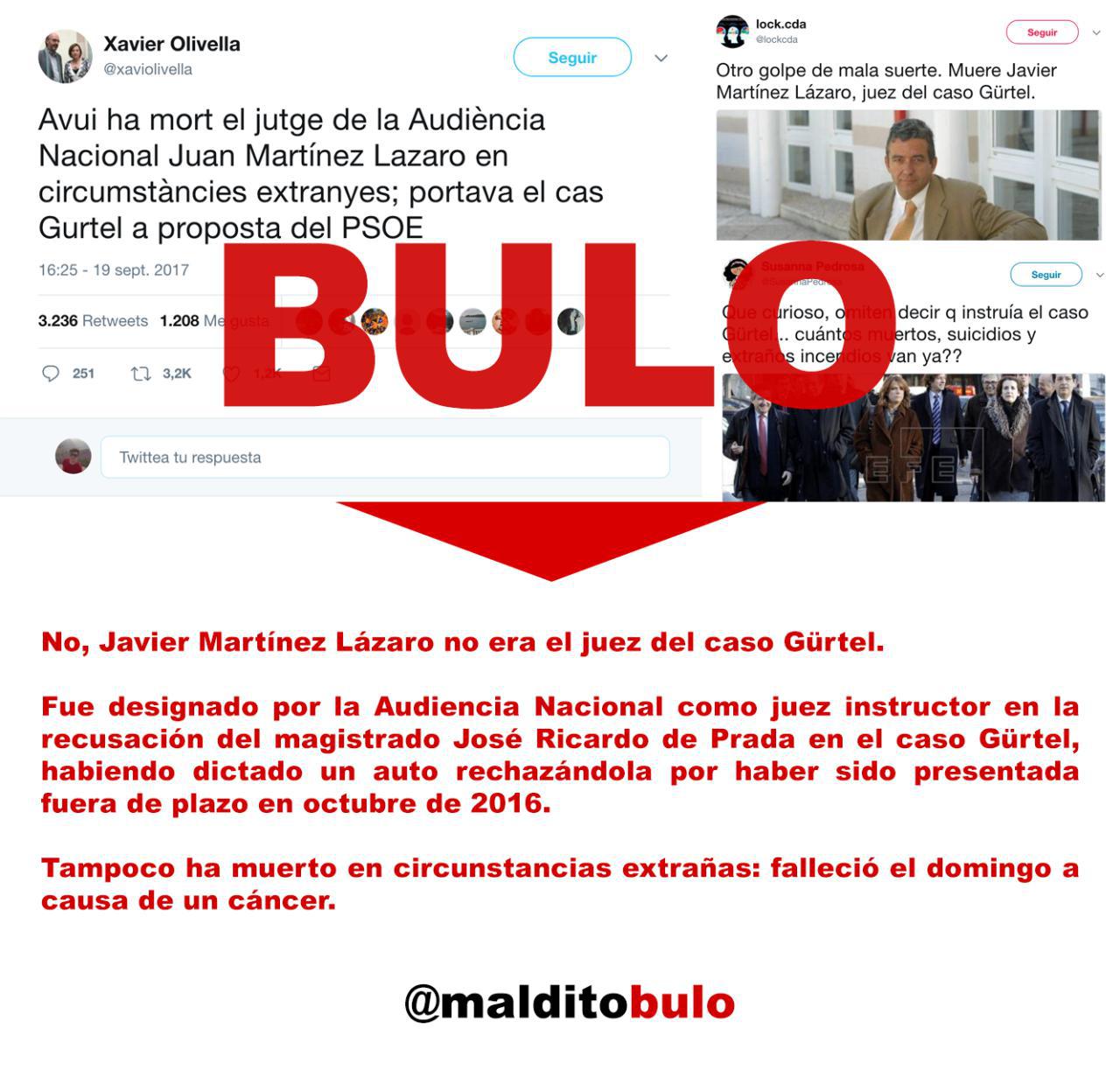 No, Javier Martínez Lázaro no era el juez del caso Gürtel. Fue juez instructor en la recusación del magistrado José Ricardo de Prada, uno de los jueces del caso Gürtel. Rechazó esta recusación por haber sido presentada fuera de plazo en octubre de 2016. Tampoco ha muerto en circunstancias extrañas: falleció el domingo a causa de un cáncer.