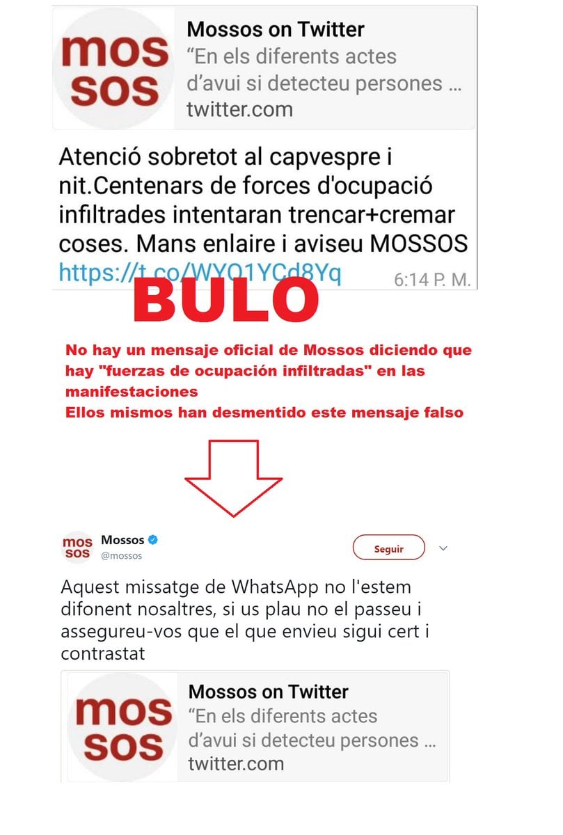 - No hay mensaje oficial de los Mossos diciendo que hay fuerzas de ocupación infiltradas en las manifestaciones.