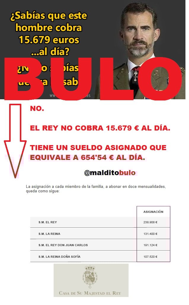 Contenidos que dicen que el rey de España, Felipe VI, cobra más de 15.000 o 21.000 euros al día.