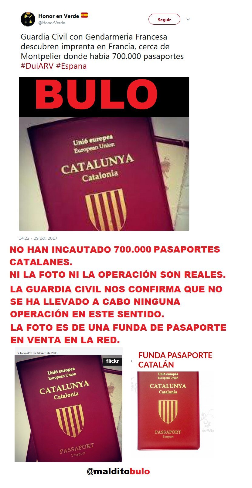 No han incautado 700.000 pasaportes catalanes en Francia. Ni la foto ni la operación son reales. La Guardia Civil nos confirma que no se ha llevado a cabo ninguna operación en este sentido. La foto es de una funda de pasaporte en venta en la red.