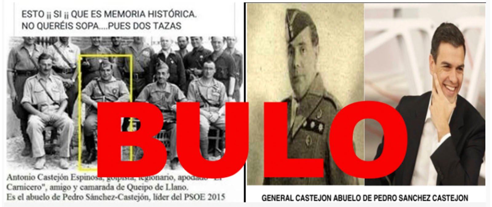 Dos imágenes se han difundido en las que se afirma que hay una relación familiar entre el Teniente Coronel Castejón y Pedro Sánchez, líder del PSOE. En una de las fotografías que se está difundiendo se ve a varios militares, uno de ellos señalado en amarillo, junto a un pie de foto en el que se afirma que el señalado es el abuelo de Pedro Sánchez. Además, se afirma que a ese militar, llamado Antonio Castejón Espinosa, se le conocía como "El carnicero" y que era un "golpista" y "legionario".
