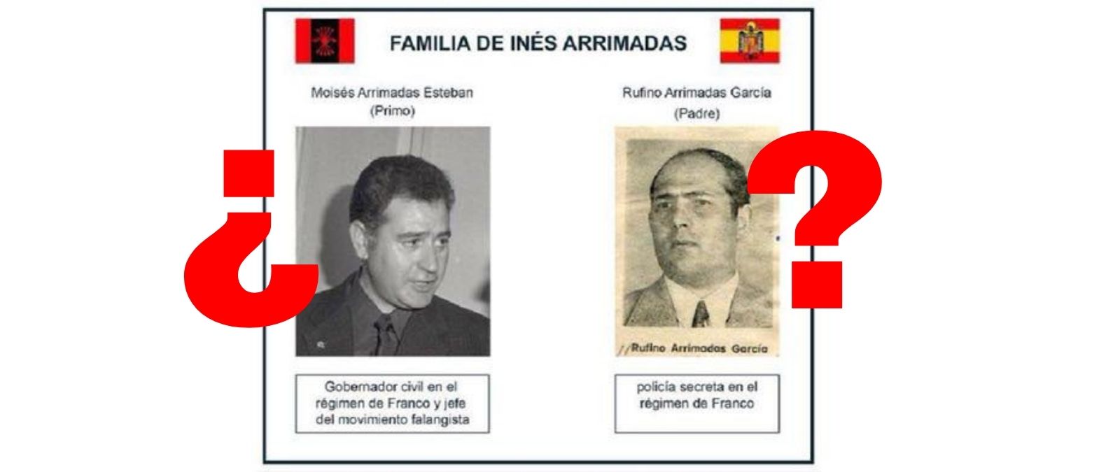 Circula una imagen en la que se pueden ver dos fotografías de, supuestamente, un primo y el padre de la actual presidenta de Ciudadanos, Inés Arrimadas. La primera foto va acompañada del texto "Moisés Arrimadas Esteban (Primo). Gobernador civil en el régimen de Franco y jefe del movimiento falangista". Sobre la otra fotografía se puede leer "Rufino Arrimadas García (Padre). Policía secreta en el régimen de Franco".