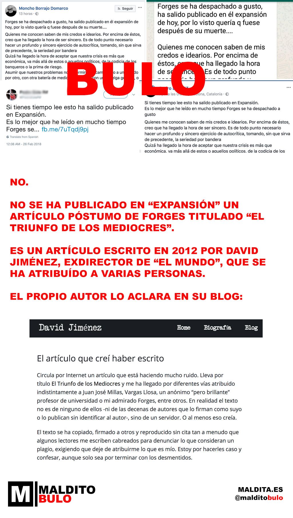 No, no se ha publicado en Expansión un artículo póstumo de Forges titulado "El triunfo de los mediocres"