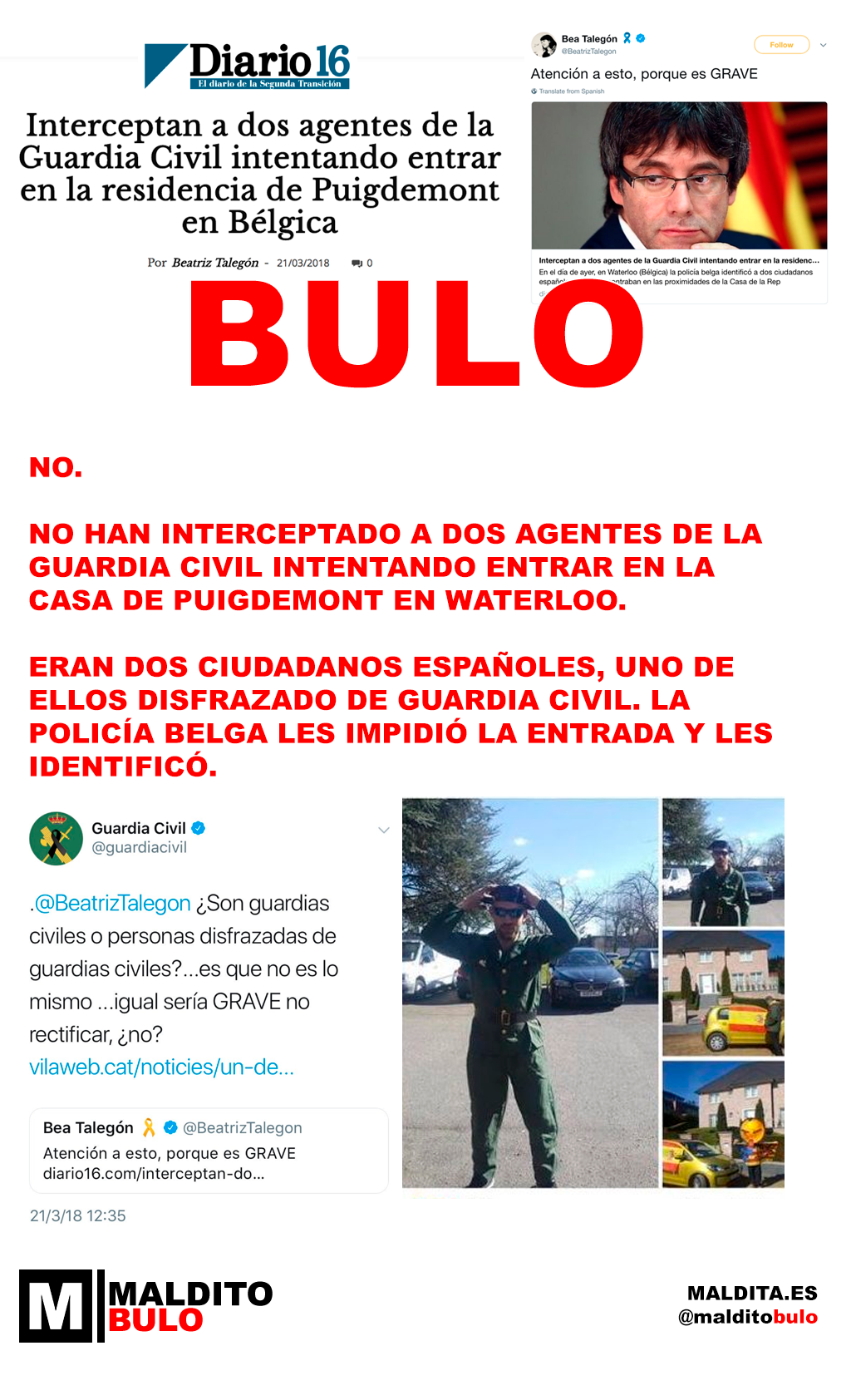 No, no han interceptado a dos miembros de la Guardia Civil intentando entrar en la residencia de Puigdemont en Waterloo