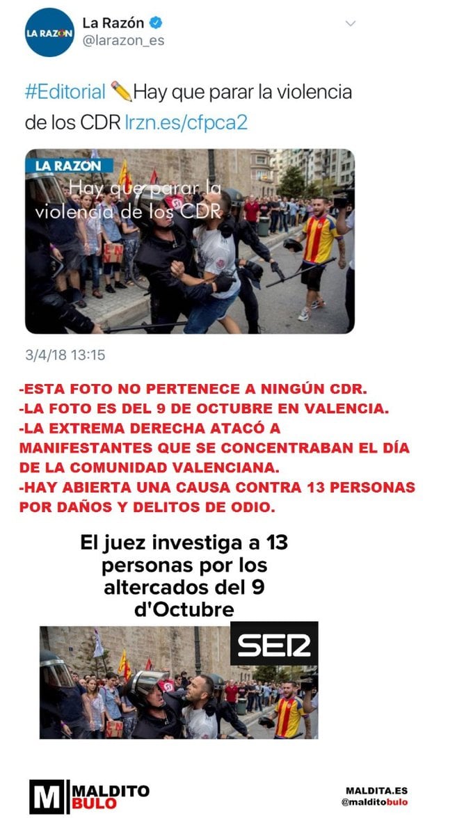 La Razón y La SER ilustran artículos con una imagen de los CDR forcejeando con la policía durante disturbios en Barcelona