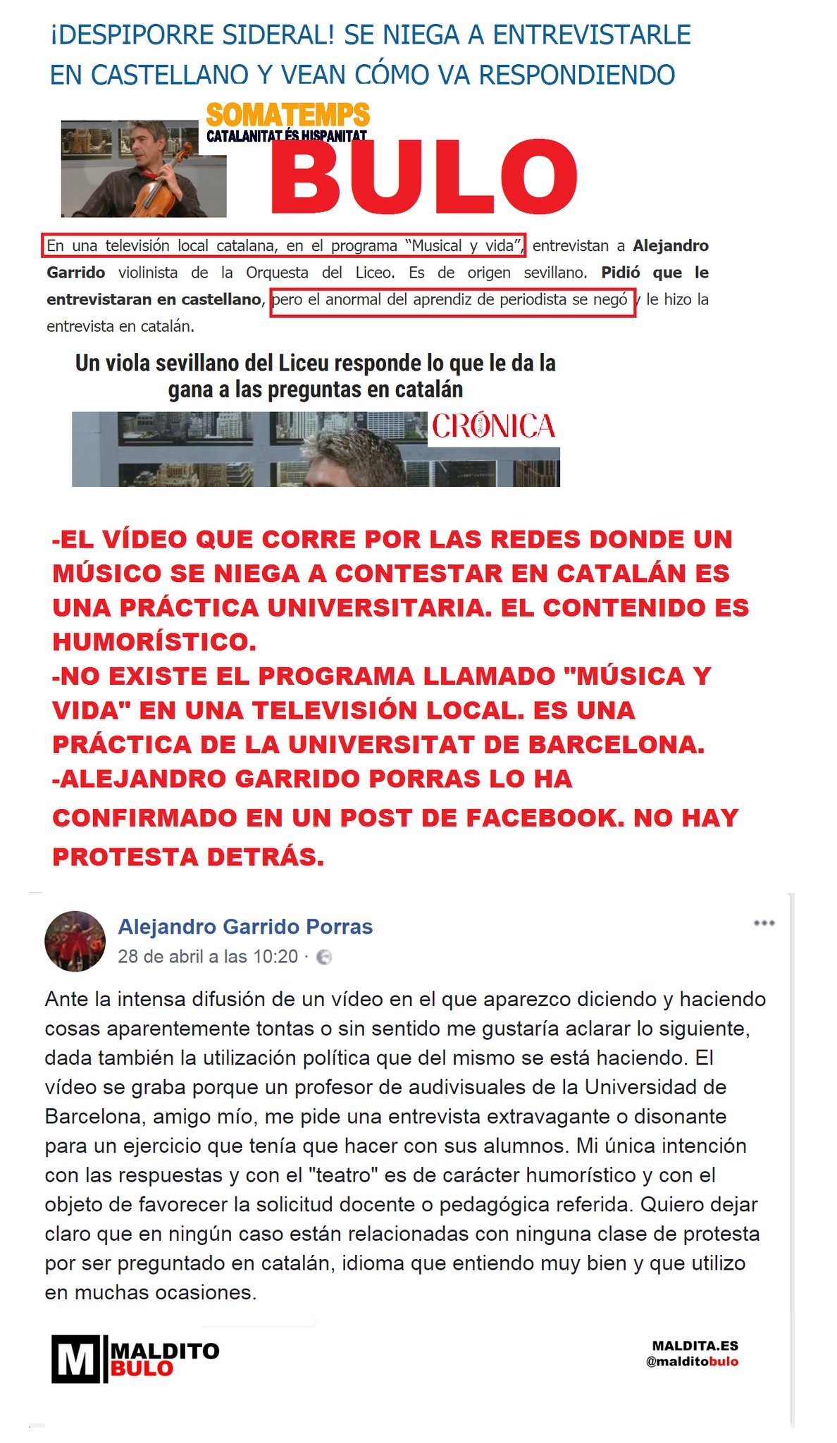 No, la entrevista a un músico negándose a contestar en catalán y respondiendo cualquier cosa a las preguntas que se le hacen no es real