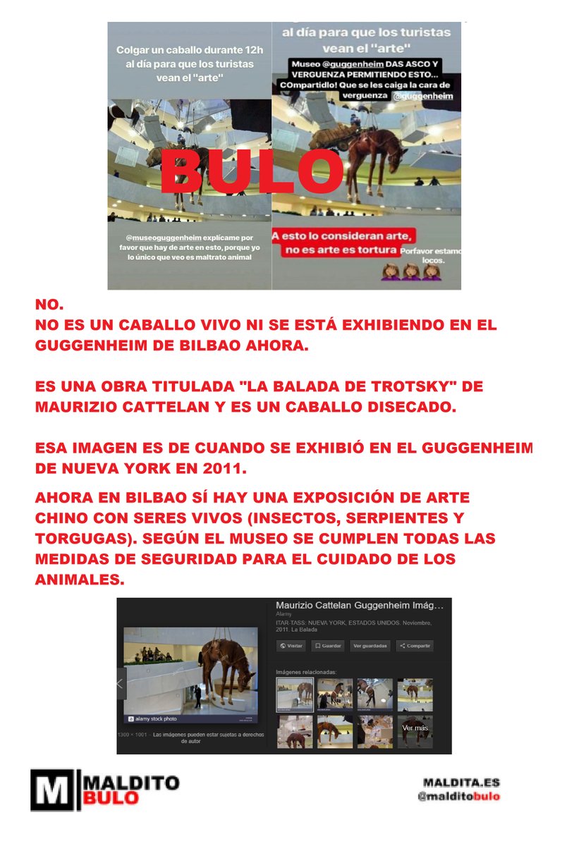 No hay una obra de un caballo colgado en el Museo Guggenheim de Bilbao. Ni vivo ni muerto. Es un caballo disecado que se expuso en 2011 en Nueva York. Sí hay una exposición con insectos y reptiles. Museo asegura que se cumplen las medidas para el cuidado de animales.