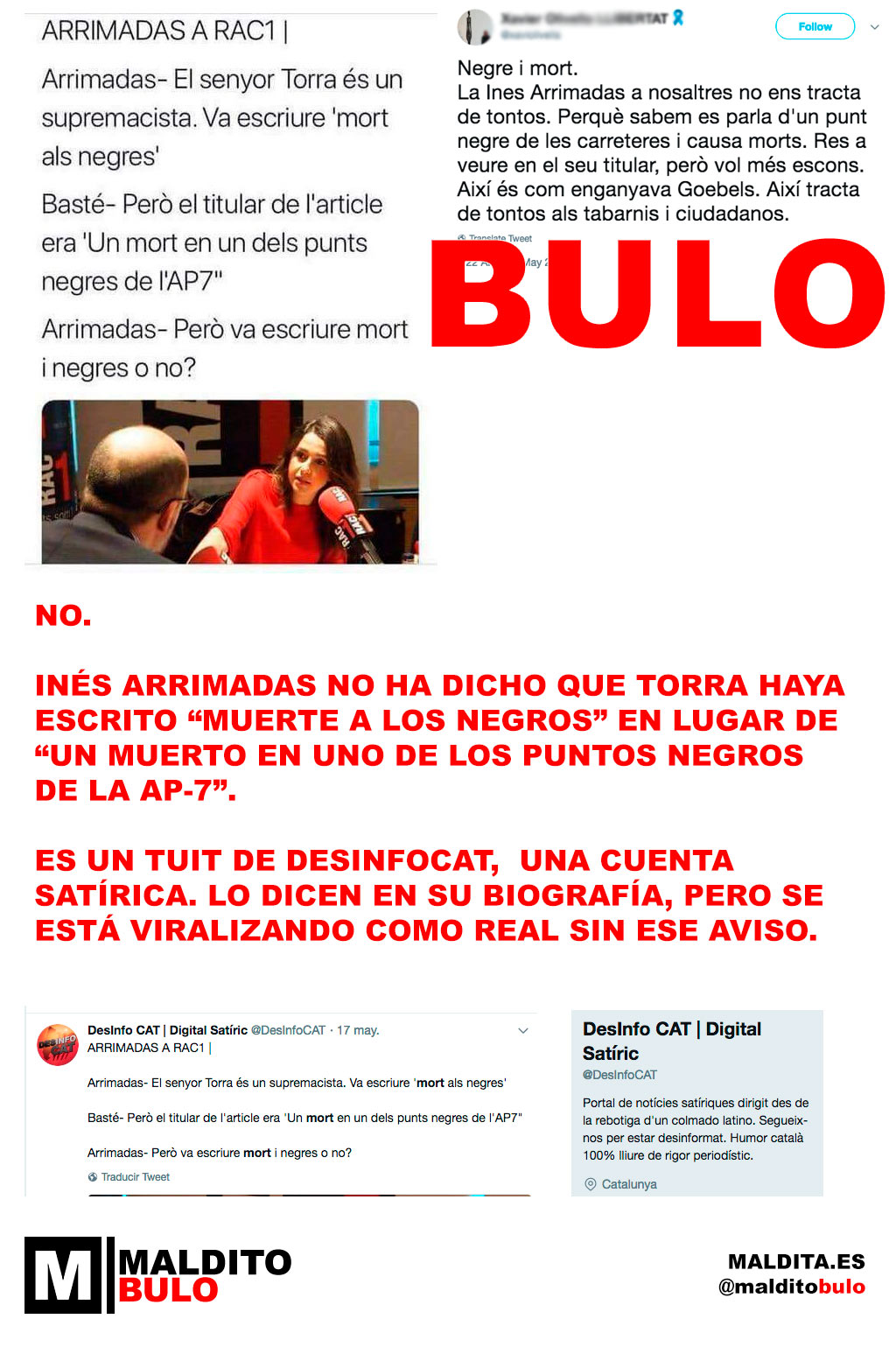 «Inés Arrimadas ha dicho que Torra ha escrito "muerte a los negros" en lugar de "muerte en uno de los puntos negros de la AP-7"»