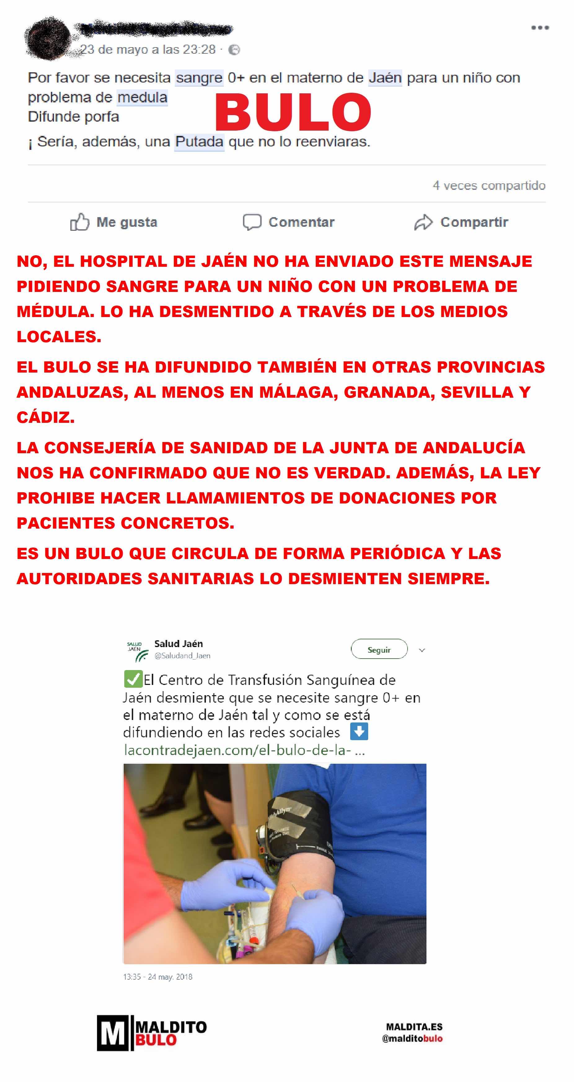 No, el Hospital de Jaén no ha publicado un mensaje pidiendo sangre para un niño con problema de médula