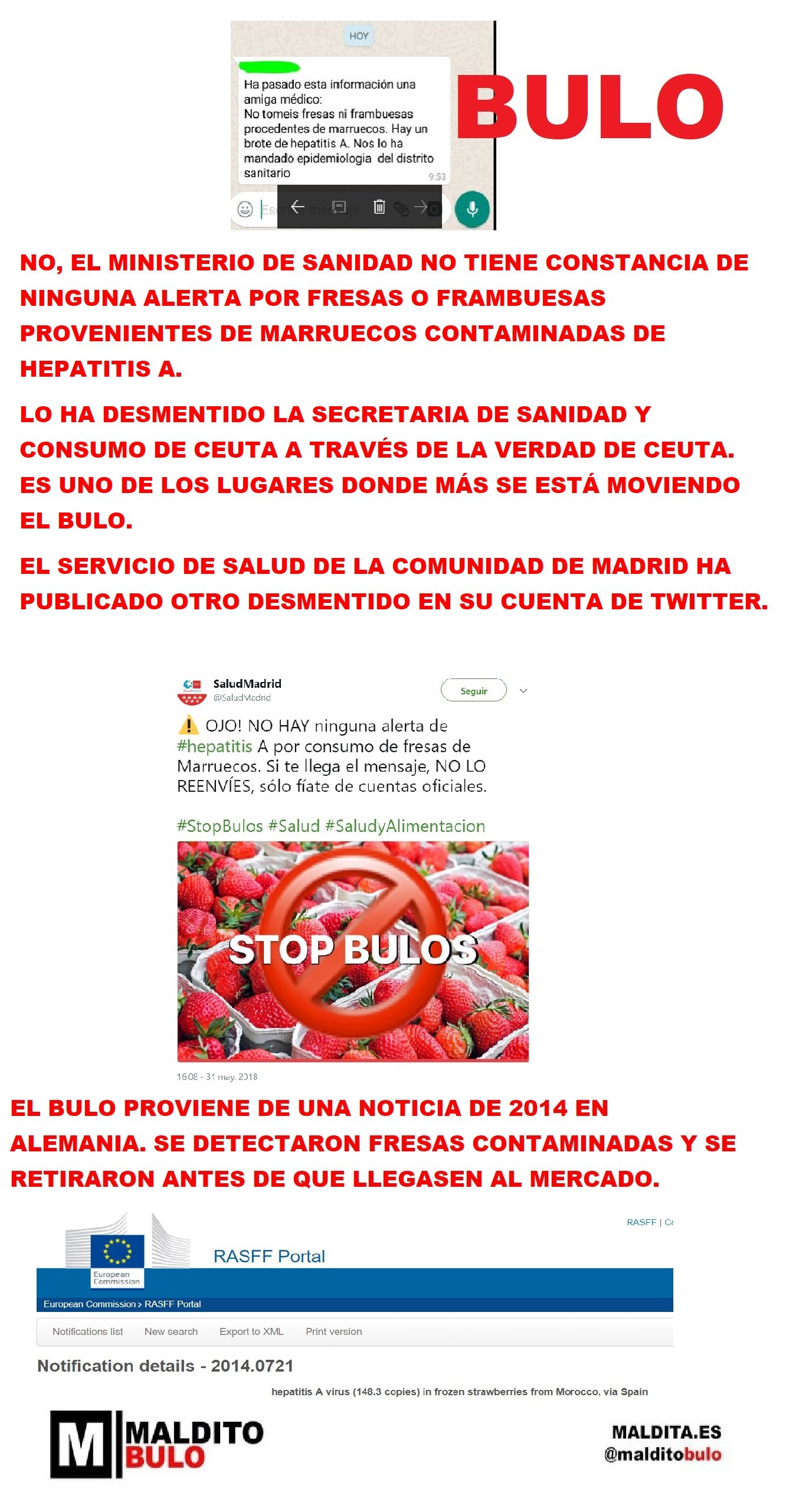 Hemos hablado con Sanidad y no tienen ninguna constancia de ninguna alerta sanitaria por fresas o frambuesas de Marruecos contaminadas de Hepatitis A. Es un bulo que se está extendiendo por Whatsapp.