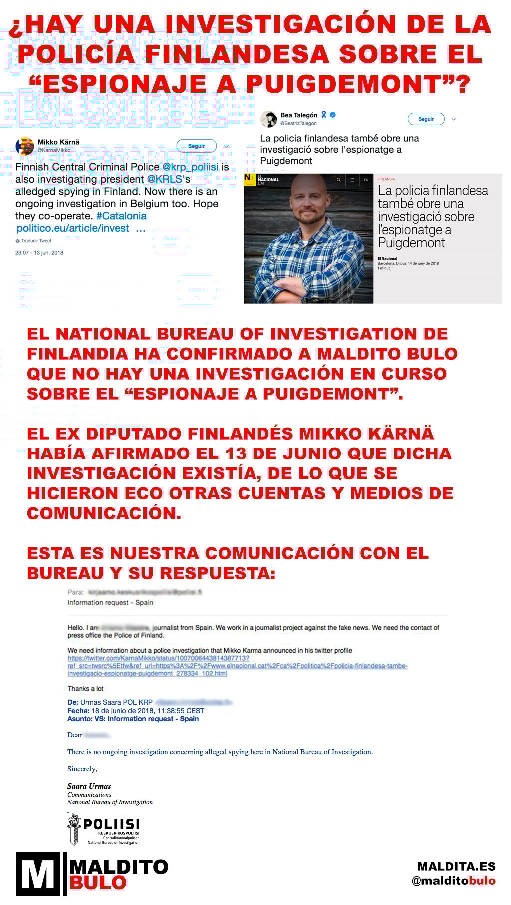 En Maldito Bulo nos hemos puesto en contacto con el National Bureau of Investigation de Finlandia y nos han confirmado que no hay ninguna investigación en curso.