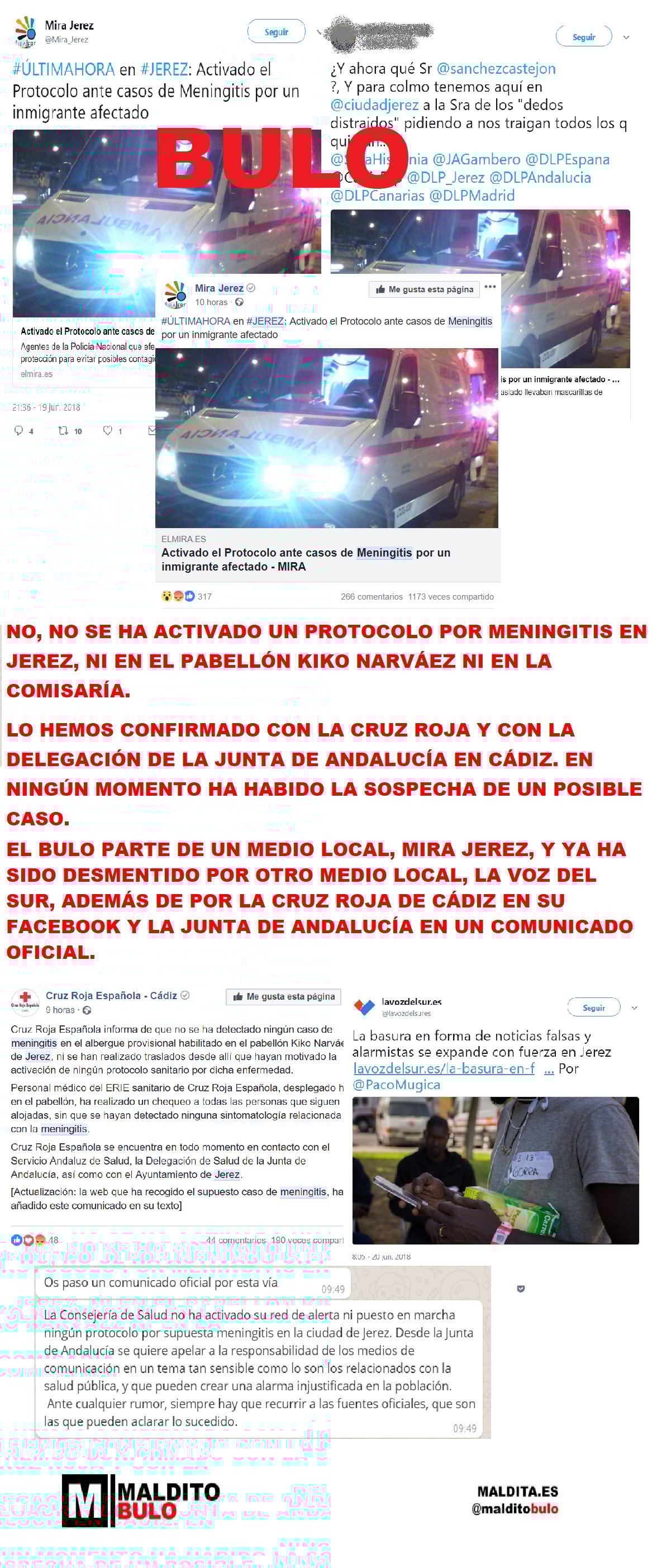 El bulo parte de un medio local, Mira Jerez, y ya ha sido desmentido por otro medio local, La Voz del Sur, además de por la Cruz Roja de Cádiz en su Facebook y la Junta de Andalucía en un comunicado oficial.