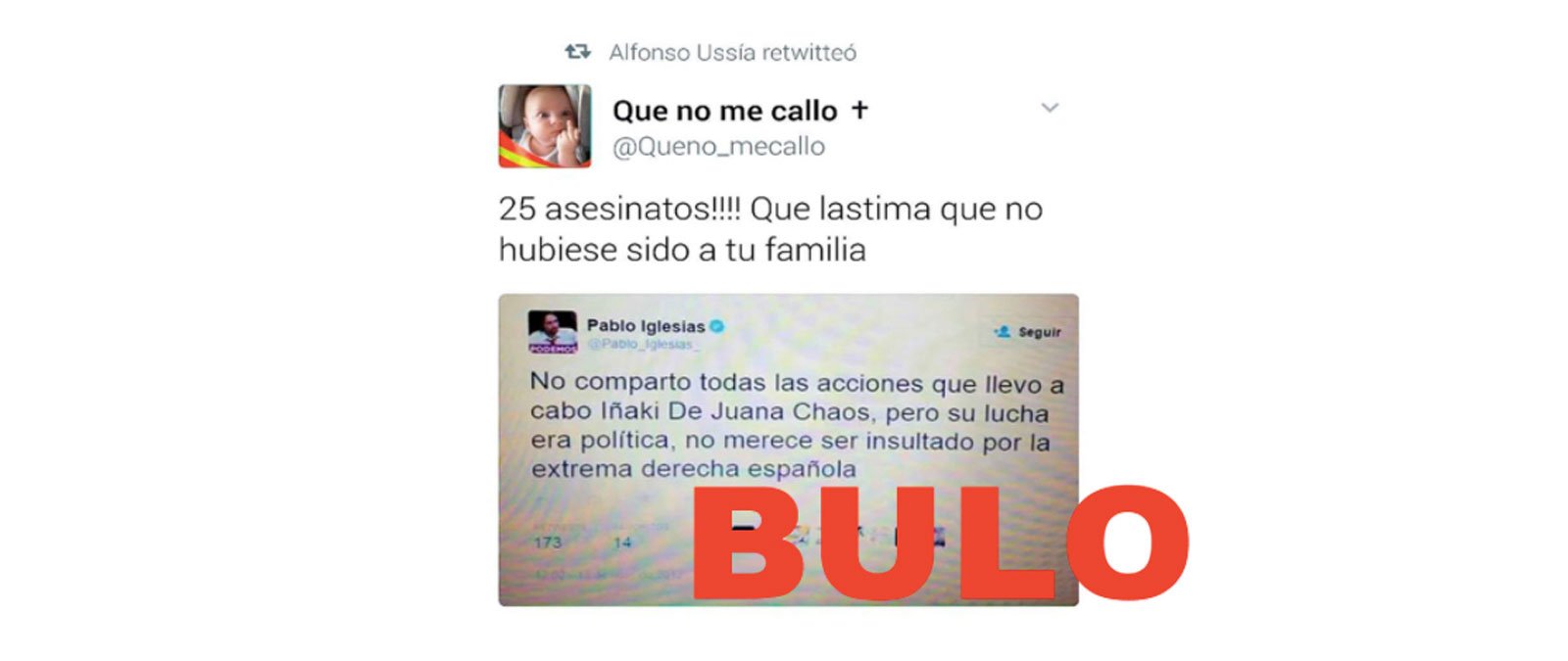 Por lo tanto, Pablo Iglesias no ha publicado un tuit en el que asegura que "no comparto todas las acciones que llevó a cabo Iñaki de Juana Chaos, pero su lucha era política, no merece ser insultado por la extrema derecha española". Es un bulo.