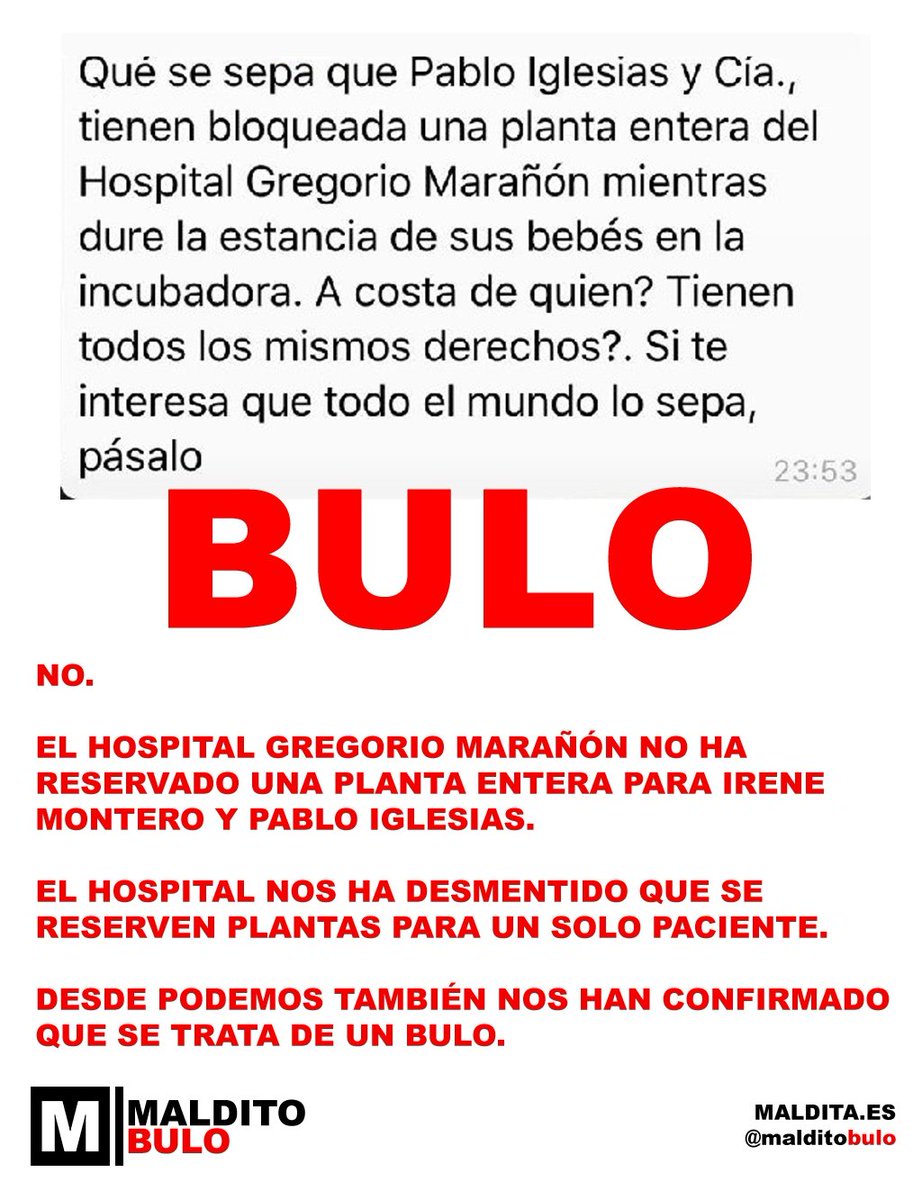 El bulo comenzó en whatsapp y ha seguido por otras redes sociales: "Qué se sepa que Pablo Iglesias y Cía., tienen bloqueada una planta entera del Hospital Gregorio Marañón mientras dure la estancia de sus bebés en la incubadora. A costa de quien? Tienen todos los mismos derechos?. Si te interesa que todo el mundo lo sepa, pásalo"