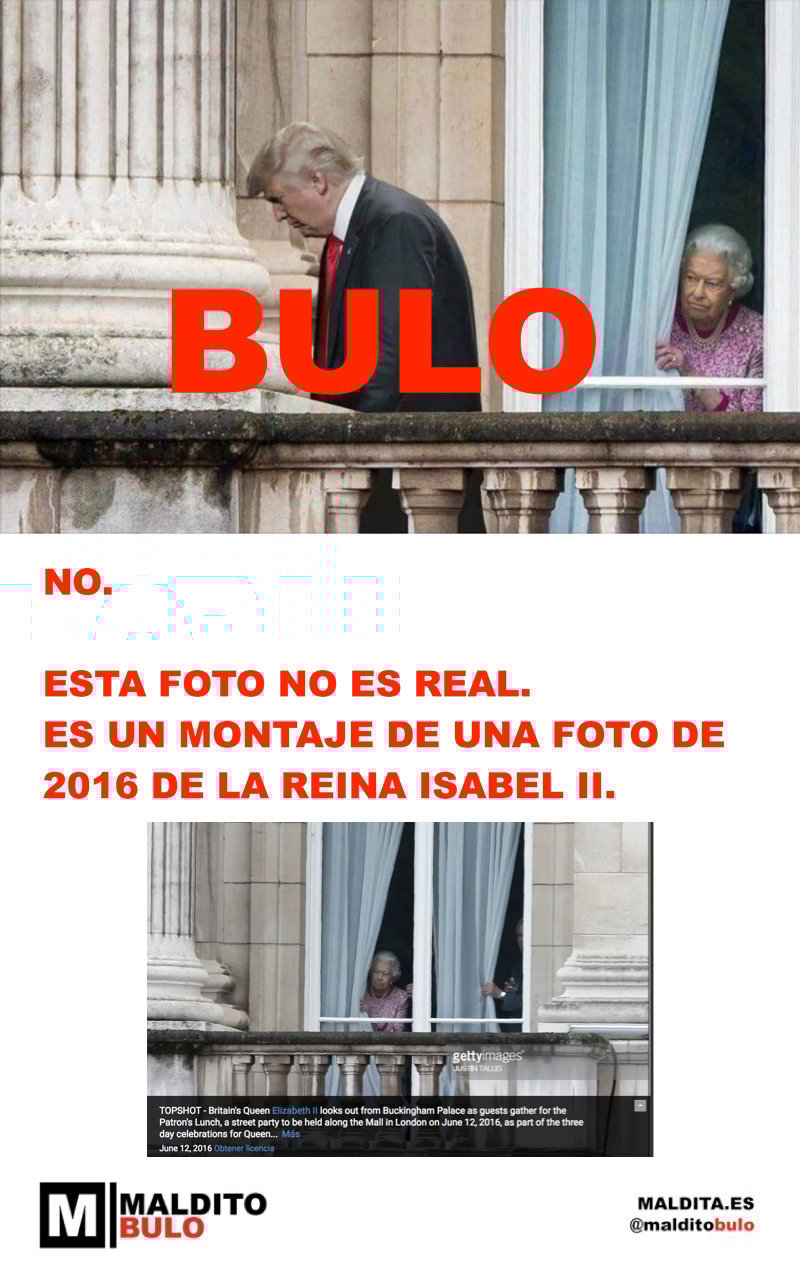 No, esta foto de la reina Isabel II espiando por una ventana a Trump no es real