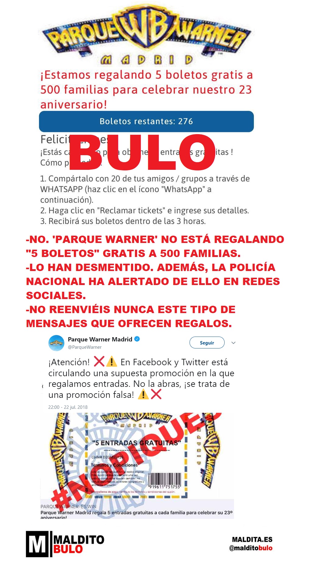 Cuidado con los falsos "regalos de empresas" que te mandan por whatsapp. Parque Warner no está regalando bonos. Se está extendiendo mucho este método para robarte datos y lo que caiga. No piques. Tanto Parque Warner como policía han confirmado que es un bulo.