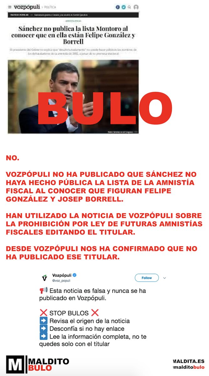 No, VozPopuli no ha publicado que Pedro Sánchez no ha hecho pública la lista de la amnistía fiscal al conocer que figuran Felipe González y Josep Borrell.