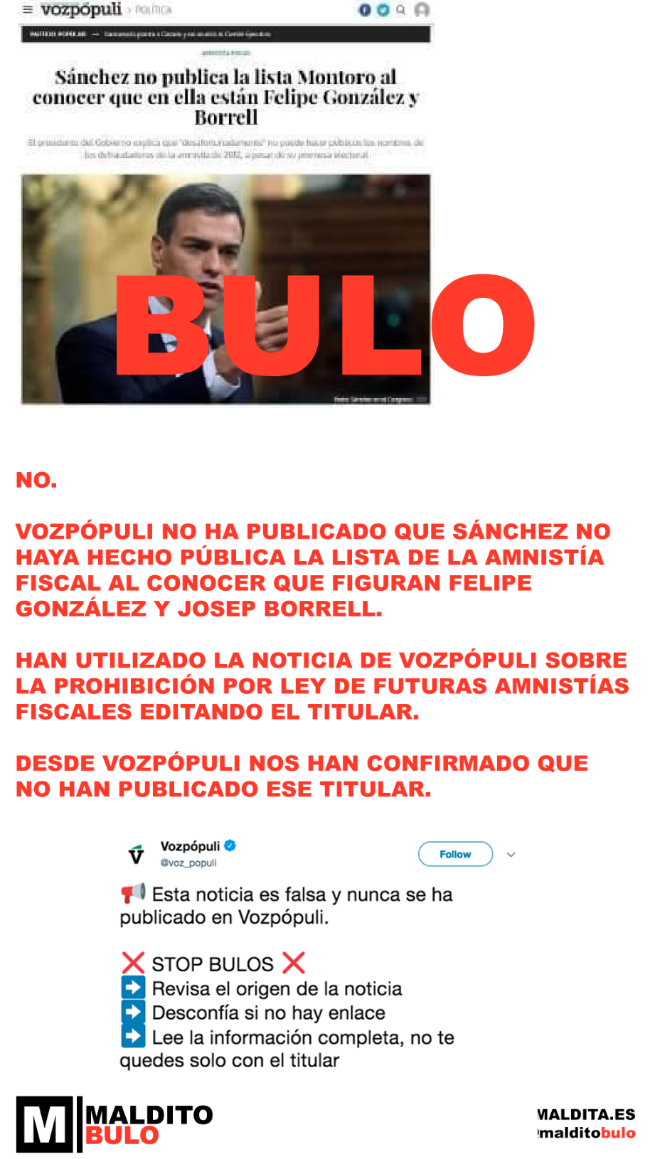 «[T] No, Vozpópuli no ha publicado que Sánchez no haga pública la lista de la amnistía fiscal al conocer que en ella están Felipe González y Josep Borrell»