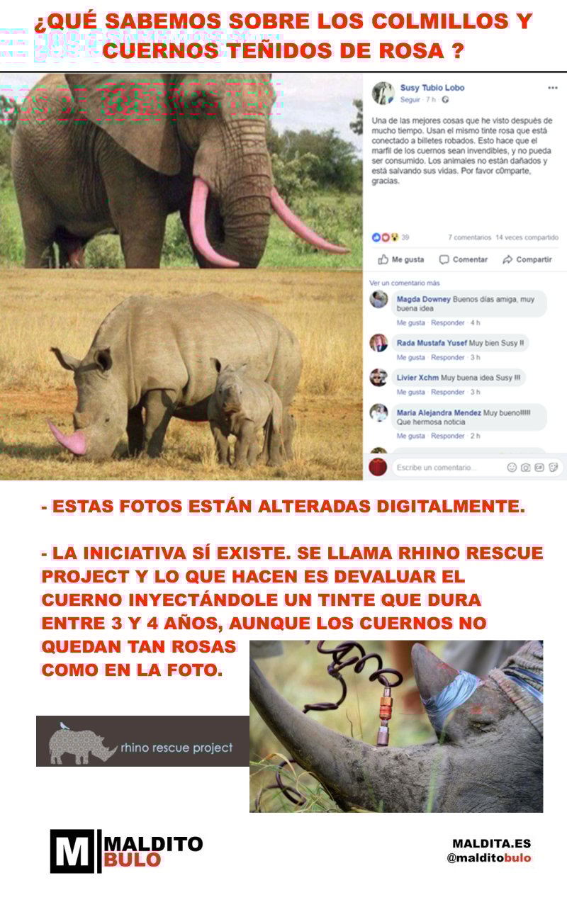 Estas fotos están alteradas digitalmente. La iniciativa existe. Se llama Rhino Rescue Project y lo que hacen es devaluar el cuerno inyectándole un tinte.
