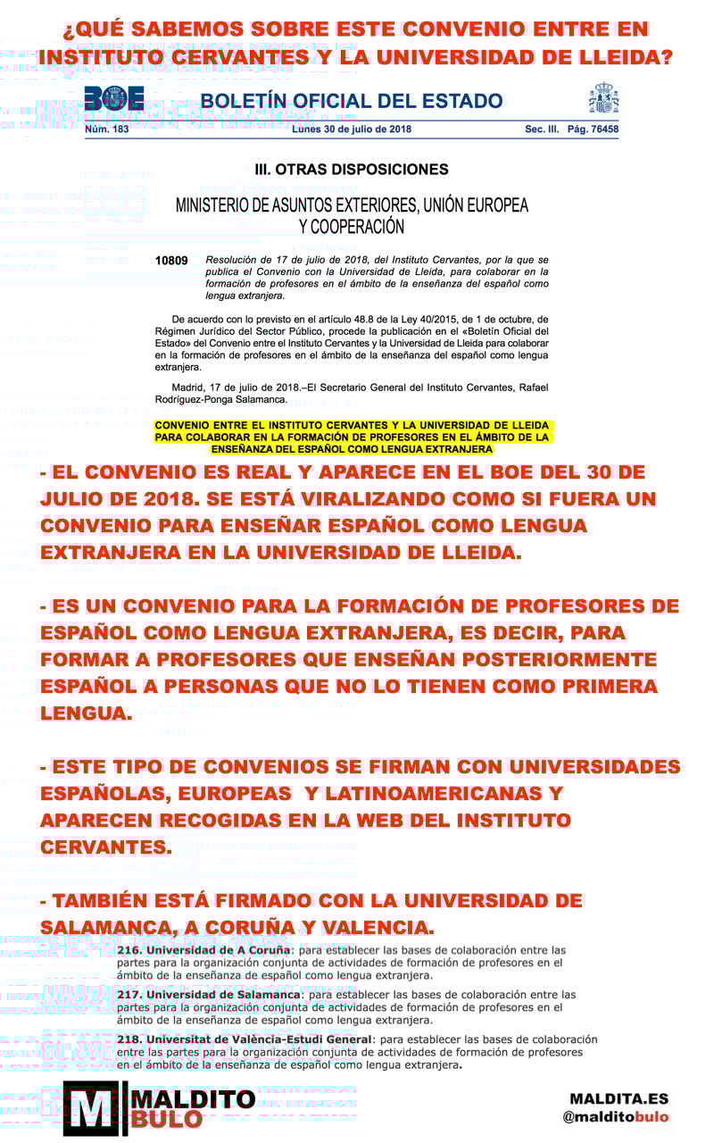 - EL CONVENIO ES REAL Y APARECE EN EL BOE DEL 30 DE JULIO DE 2018. SE ESTÁ VIRALIZANDO COMO SI FUERA UN CONVENIO PARA ENSEÑAR ESPAÑOL COMO LENGUA EXTRANJERA EN LA UNIVERSIDAD DE LLEIDA.