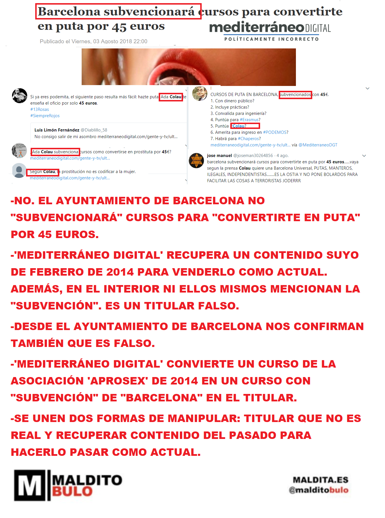 Barcelona" no "subvencionará" cursos para "convertirte en puta". Es un titular inventado de Mediterráneo Digital. Dentro de la "noticia" ni se menciona. Recuperan un texto suyo de 2014 y lo hacen pasar por actual. Ayuntamiento de Barcelona también nos confirma que es falso. Titulares que no se corresponden con el contenido o directamente inventados, recuperar noticias del pasado para hacerlas pasar como actuales; son formas de desinformar.