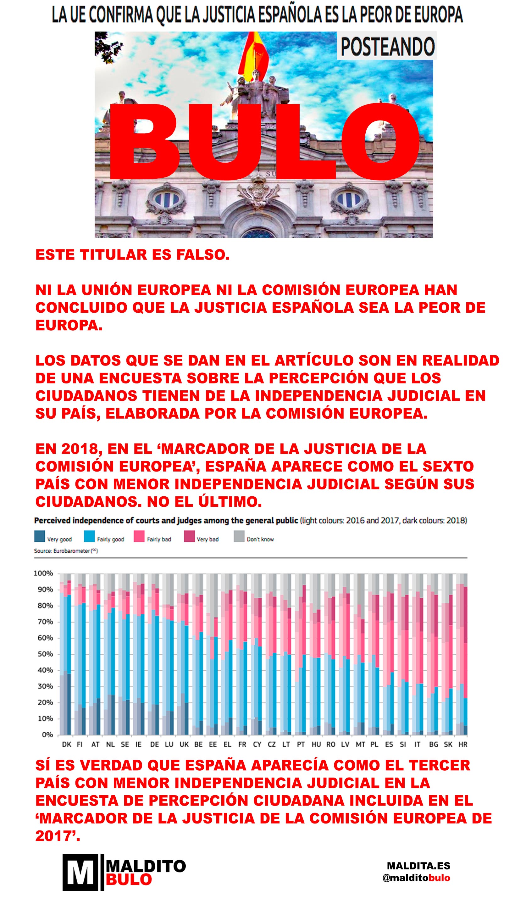 - Sí es verdad que España aparecía como el tercer país con menor independencia judicial en la encuesta de percepción ciudadana incluida en el 'Marcador de la Justicia de la Comisión Europea de 2017'.