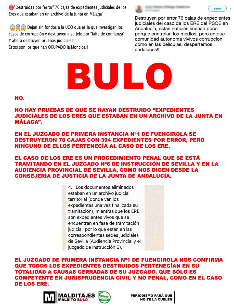 NO No se han destruido “expedientes judiciales de los Eres” del archivo de la Junta en Málaga. En el juzgado de 1a instancia de Fuengirola, de jurisprudencia civil, se destruyeron 78 cajas de expedientes de casos cerrados. Los ERE es una causa penal que se instruye en Sevilla.
