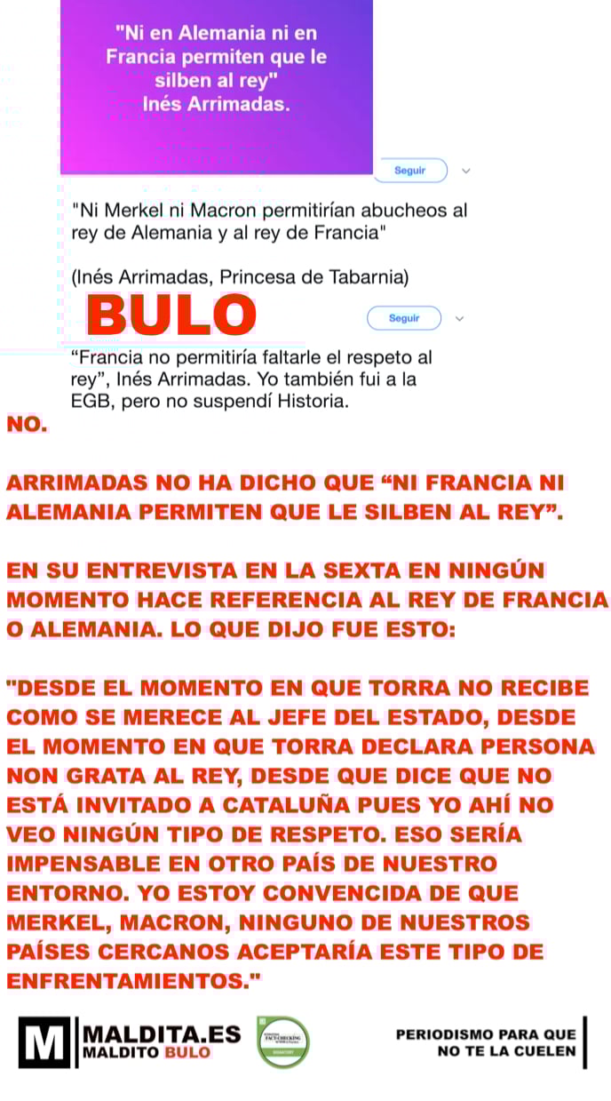 Arrimadas no ha dicho que “ni Francia ni Alemania permiten que le silben al Rey” En ningún momento hace referencia al Rey de Francia o al Rey de Alemania: habla de jefes de Estado.