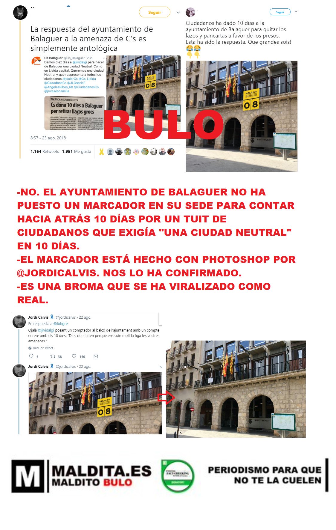 «[T] No, el ayuntamiento de Balaguer no ha puesto un marcador en su sede por un tuit de Ciudadanos que exigía una "ciudad neutral"»