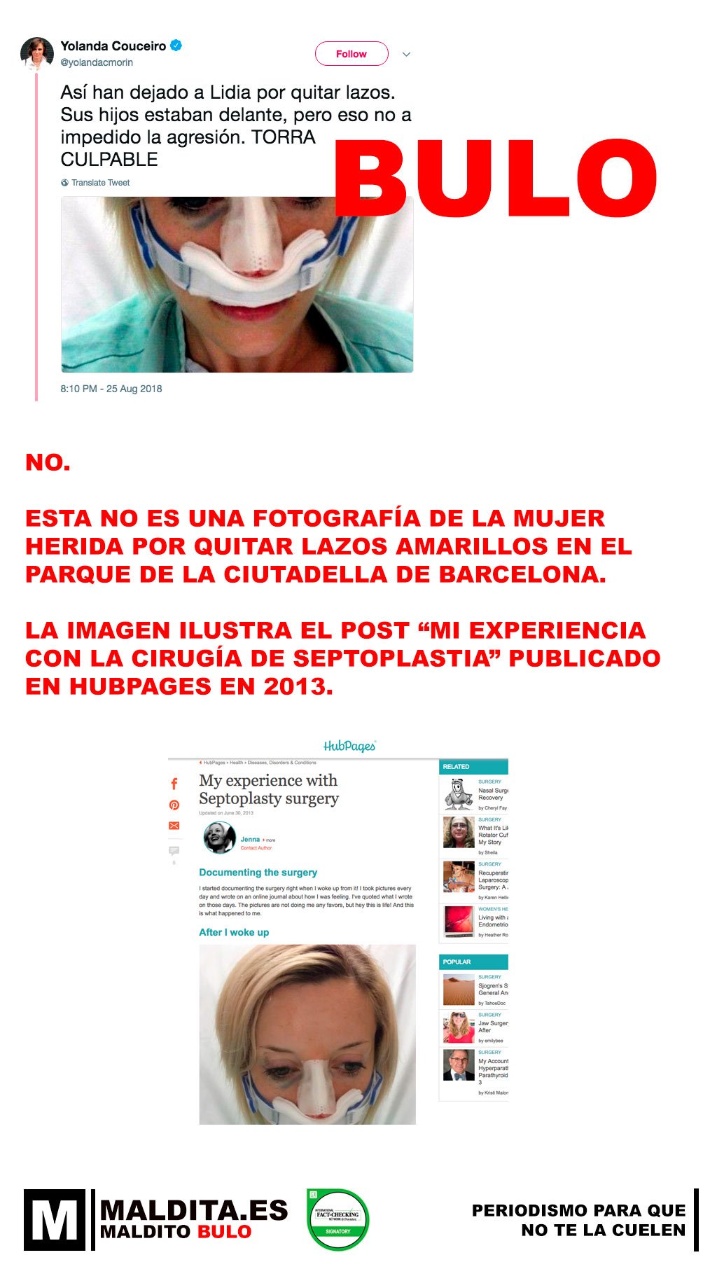 NO. Esta no es una fotografía de la mujer herida por quitar lazos amarillos en el Parque de la Ciutadella en Barcelona. Es una foto de un post de 2013 sobre una cirugía nasal.