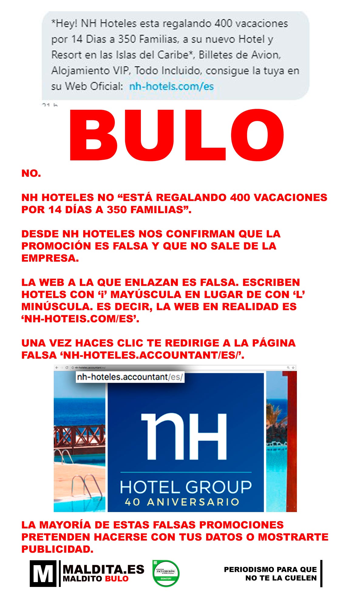 «[T] No, NH Hoteles no "está regalando 400 vacaciones por 14 días a 350 familias"»